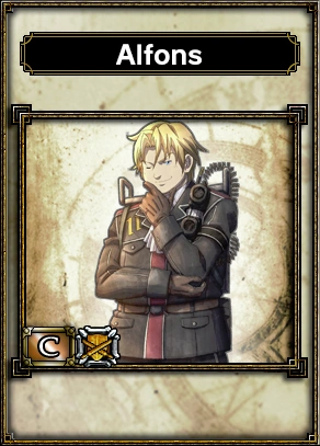Alfons has a cheerful and frank personality and is quite considerate of others. He enjoys taking on the role of the squad clown, and often jokes about his weight to relieve tense situations. He is always a gentleman when interacting with women and likes to spout cheesy, clichéd lines, but remains unable to impress the ladies for some reason. Alfons likes to refer to himself as "the falcon of Gallia", and seems to have developed a unique friendship with the haughty Leila.
