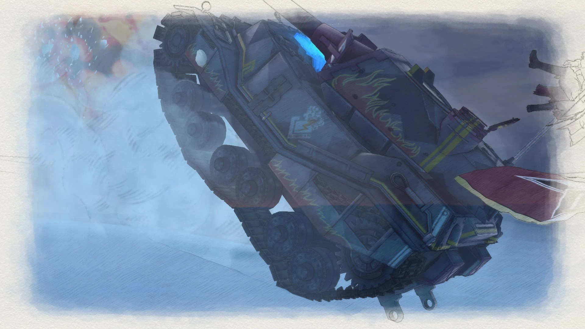 While Ausbruch had officially disbanded, the unit lived on in all but name, and certainly in the eyes of its commander, who continued to fly an enormous banner of the unit logo from his tank. Ausbruch received access to even more advanced equipment, with money being no object as far as Belgar was concerned. The Vulcan in particular received numerous modifications, ultimately including a specialised system for channelling the energy produced by the Valkyria Crymaria Levin.