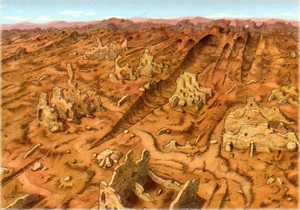 The remnants of human dwellings dot the eroded landscape, suggesting that this area was once the site of a large city. These days, violent sandstorms assail travelers, and visitors to the region are scarce.