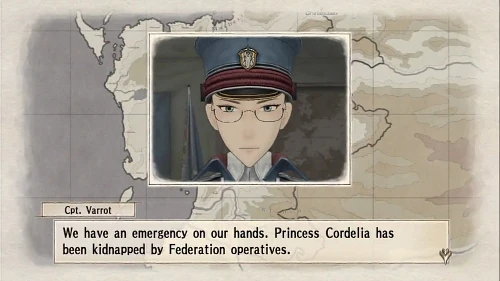 As the pair bid each other goodnight, the palace explodes in panic. General Georg von Damon appears in front of them and reveals that Her Highness Cordelia has been kidnapped by Federation agents under Jean Townsend as part of a plot to annex Gallia and orders Captain Varrot to rescue the princess.