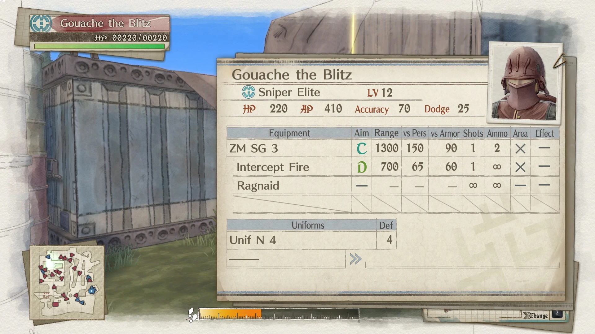 Gouache the Blitz is a Sniper Elite ace in Valkyria Chronicles 4. He is one of four aces encountered in the first map of the "Squad E, to the Beach!" DLC, Raiding the Base.