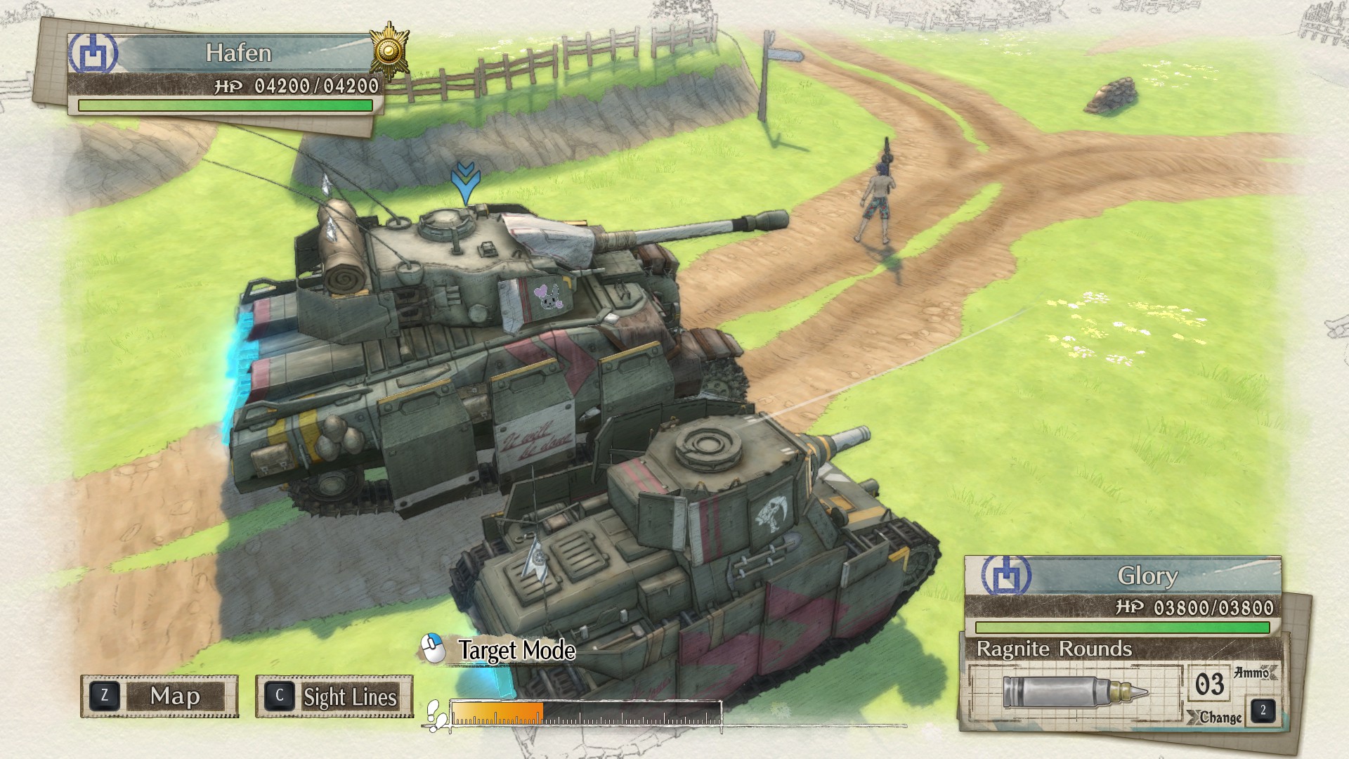As is typical for Valkyria Chronicles tanks, Hafen has three main weapons: the first is the primary gun, a long-range weapon of slightly questionable accuracy which delivers enormous damage to vehicles and can kill infantry too if it manages to hit them. New to Valkyria Chronicles 4 is the ability for the Hafen to launch Co-Op Attacks with its main gun: it can Co-Op fire with the DLC Edelweiss and the Glory as long as the latter is using its anti-armour turret, and with allied Lancers as well. Forming a "firing squad" of Lancers around the Hafen allows an enormous amount of anti-tank damage to be delivered for a single Command Point.