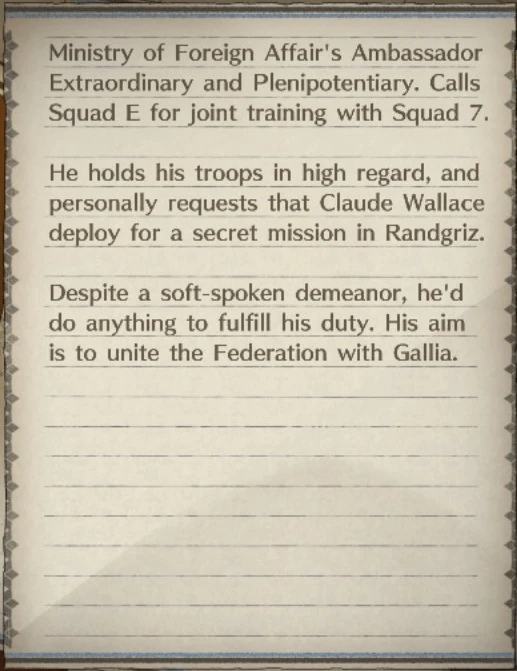 Despite the Federation's official support for Archduchess Cordelia as the legitimate leader of Gallia, Townshend brokered a deal with Gilbert Gassenarl that would see Gallia join the Federation should the GRA succeed in its rebellion. As such, the Federation provided the GRA access to a wide range of resources, ranging from ragnite and small arms to the battleship Dandarius.