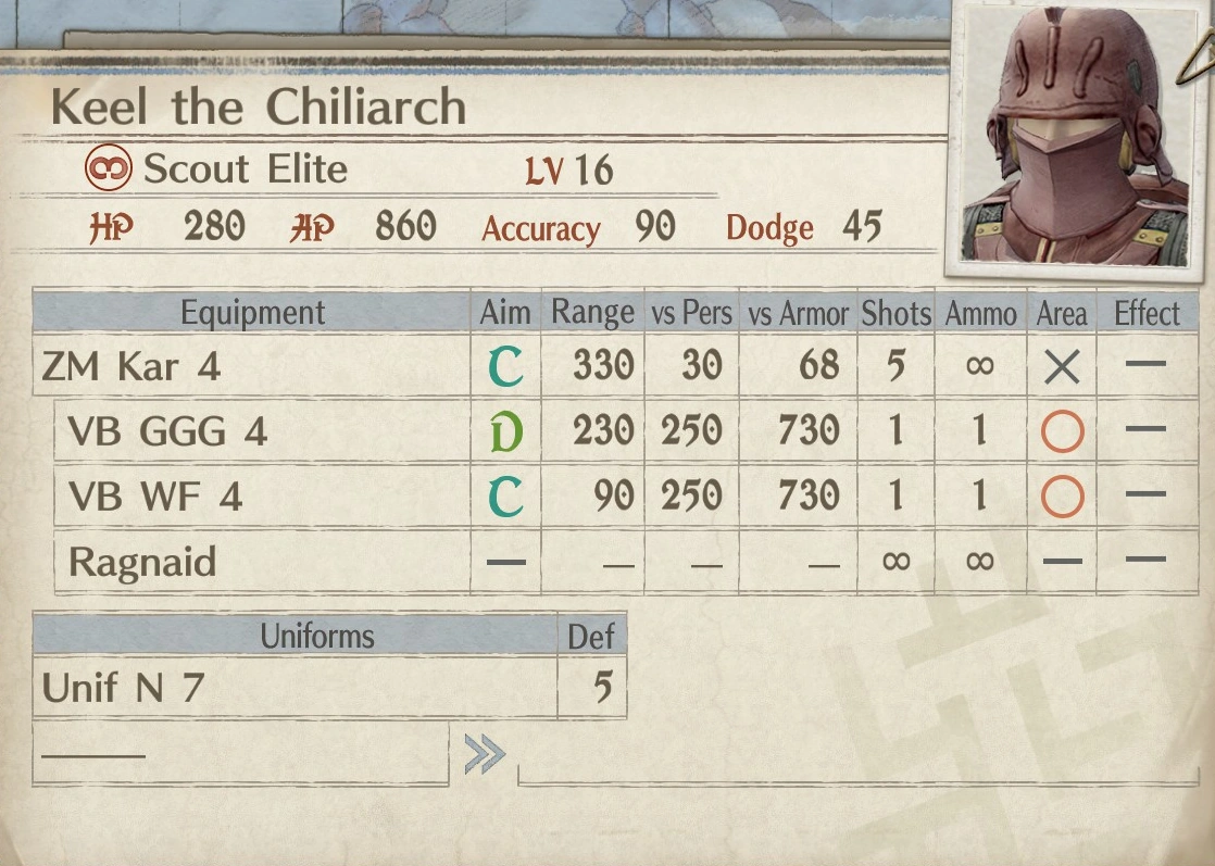 Keel is located in a small cave off to the right of the Imperial base camp as viewed in Command Mode. He has a lot more health than his counterpart and has slightly higher accuracy, though his dodge rating has been downgraded slightly compared to Saki's.