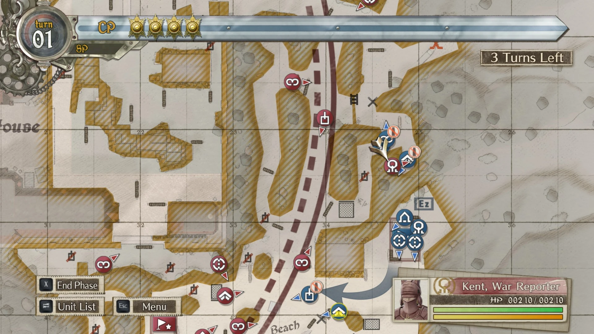 Kent is hidden in an alcove directly north of Squad E's base camp that's guarded by a trooper nearby. He is entirely passive and will not take action though he will still deliver interception fire to enemy units if he's been turned around enough.