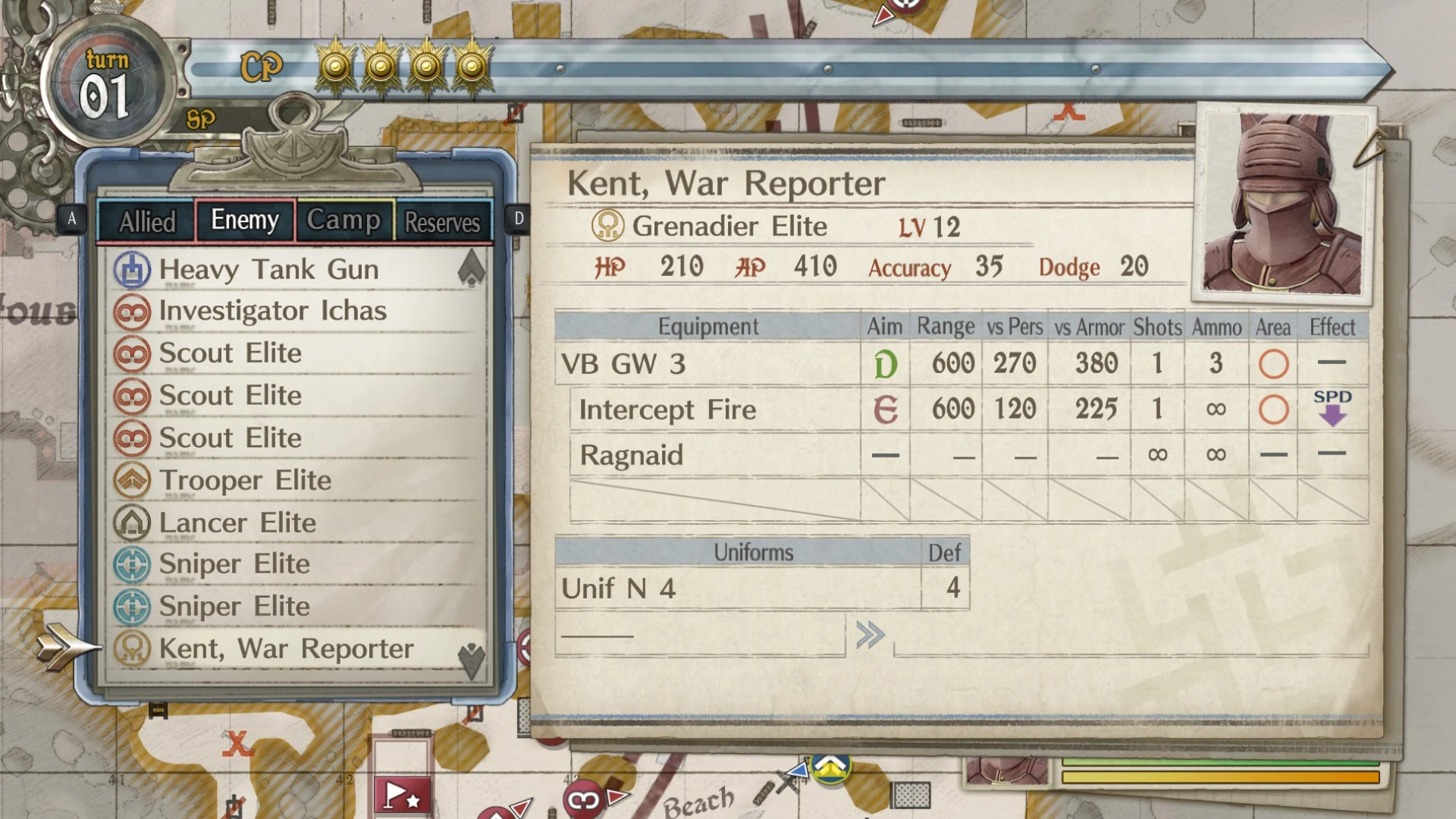 Kent, War Reporter is a Grenadier Elite ace in Valkyria Chronicles 4. He is one of four aces encountered in the first map of the "Squad E, to the Beach!" DLC, Raiding the Base.