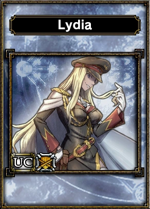 Lydia makes an appearance in Samurai & Dragons as a UC monster card. As a UC monster card, Lydia is of the Mercenary race and possesses the unique base skill, Return to the Front.