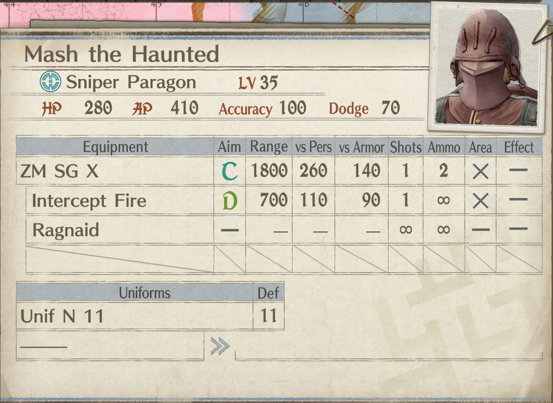 Mash the Haunted (千人狩りマシター Sen-ri kari mashitā?) is a Sniper Paragon Ace found in Valkyria Chronicles 4. He is the final form of recurring Ace Mash the Hunter, promoted all the way up to a level 35 Sniper Paragon. He is encountered in the second Challenge Skirmish.