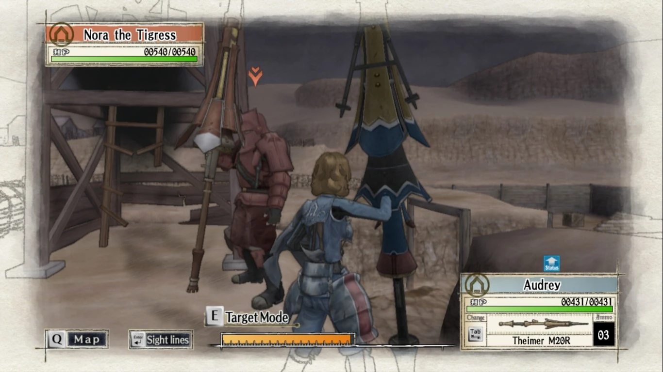 Nora the Tigress is a Lancer Elite Ace in the Expert version of the Naggiar Plains skirmish in Valkyria Chronicles. She is positioned on top of the central watchtower on the Imperial side of the trenches. While she will not move, even if she is knocked off the tower, she will fire on anyone within her line of sight. Because of her lance's stats, it is effectively a sniper rifle that can one shot the majority of Squad 7 members, especially if she benefits from the height multiplier from the watchtower.