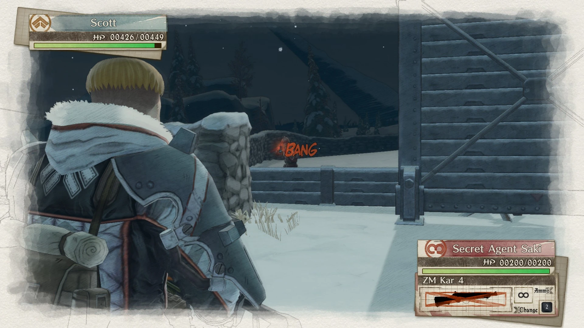 Secret Agent Saki is concealed behind a metal barricade at the lower-left of the map as seen in Command Mode, and only comes out of hiding if one of the three soldiers is nearby.