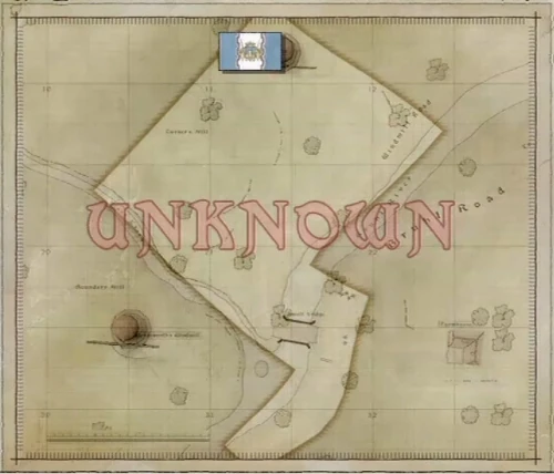 The main area of the map is an open grassy field, which slopes slowly upwards towards Turner's Windmill in the far North East. A dirt trail winds down the East side of the hill bordering the Bruhl River and continues through the centre of the map, crossing a small bridge to link to the small area on the Southeast side which links North Bruhl with the town in the south.