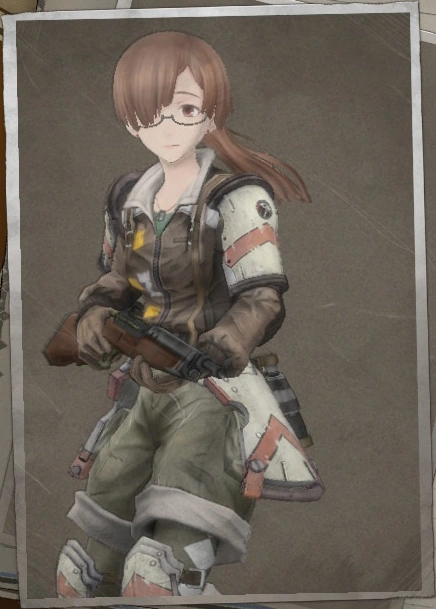 Counting with the standard scout equipment, Teresa is a medium heighed soldier in squad E. Her hair is organised in a long pony tail that cascades through her shoulders, with a long free lock covering her right eye. She wears glasses and usually has a creeping smile.