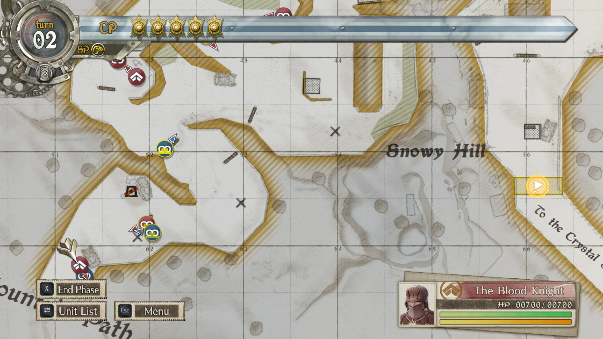 The Blood Knight is positioned behind a wrecked tank in the SW corner of the map in the opposite direction the player needs to go to fulfill their objective. He is guarded by a small number of units, including a sniper on the watchtower along with a scout and trooper.