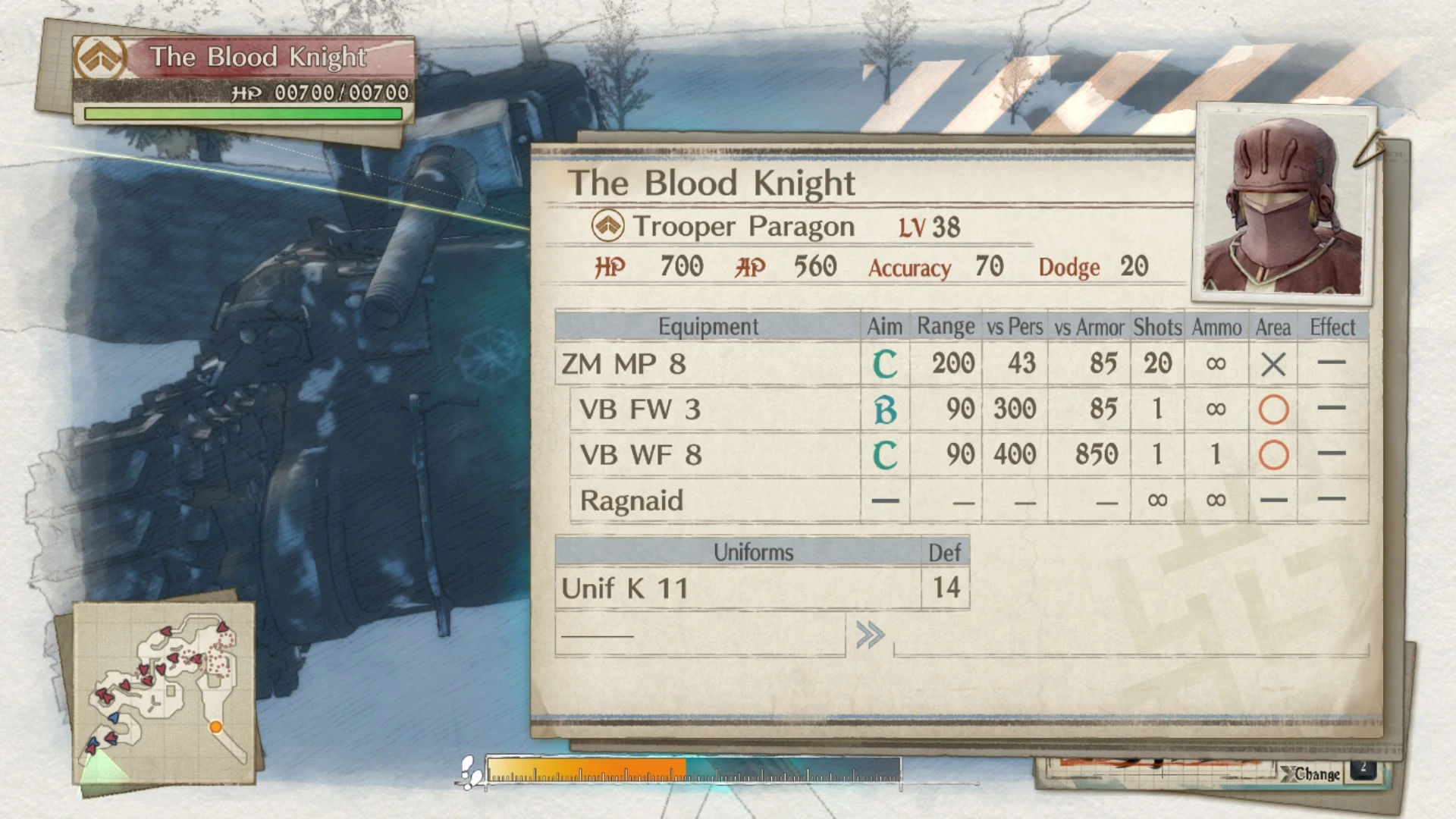 The Blood Knight is a Trooper Paragon ace in Valkyria Chronicles 4. He is found in the Expert Skirmish DLC mission Escape from a Dire Situation.