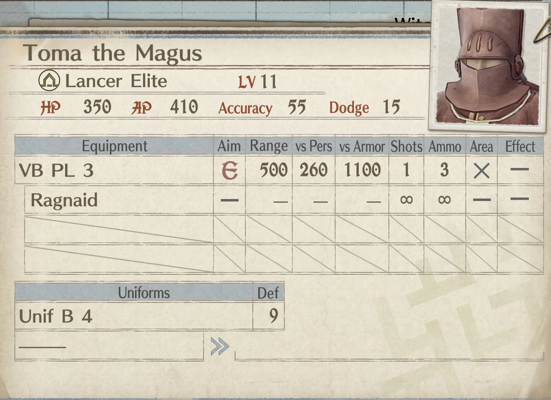 Defeating him rewards the player with a VB PL 3(e), an Imperial Lance shorter-ranged, but more accurate and powerful than the basic VB PL 3 he uses himself.