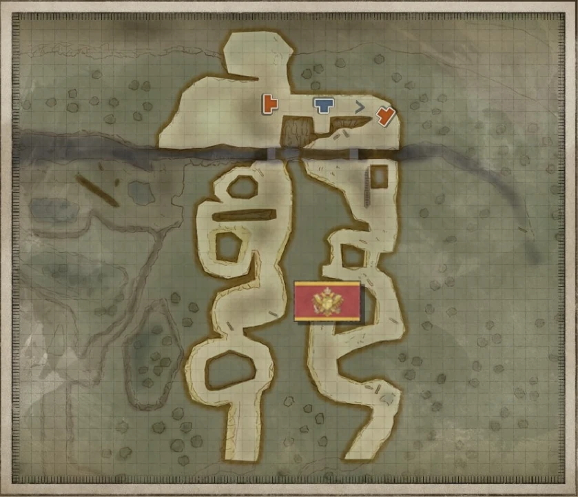 Jimmy, Odin, and Lily will start on the path connecting the west and east sections of the map, and must make their way along the east path south to capture the Imperial base camp tucked in a corner, across the south most watchtower.