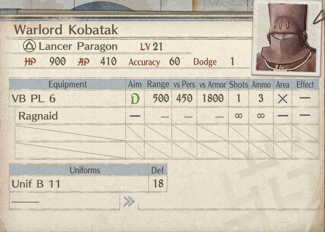 Warlord Kobatak (軍人コバタック Gunjin kobatakku?) is a Lancer Paragon Ace found in Valkyria Chronicles 4. He is found guarding one of the Imperial base camps in the DLC map Expert Skirmish 2: Blitz Assault.