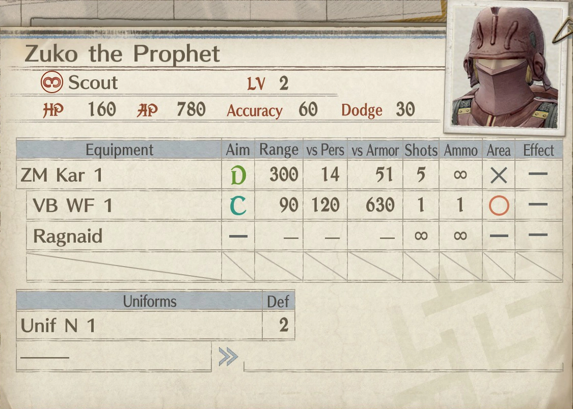 Zuko the Prophet (新鋭ズッキルト Shin'ei zukkiruto?) is a Scout Ace found in Valkyria Chronicles 4. He is a stand-in for Thane the Cadet in Normal Skirmish 2, and has the same item drop but inferior stats.